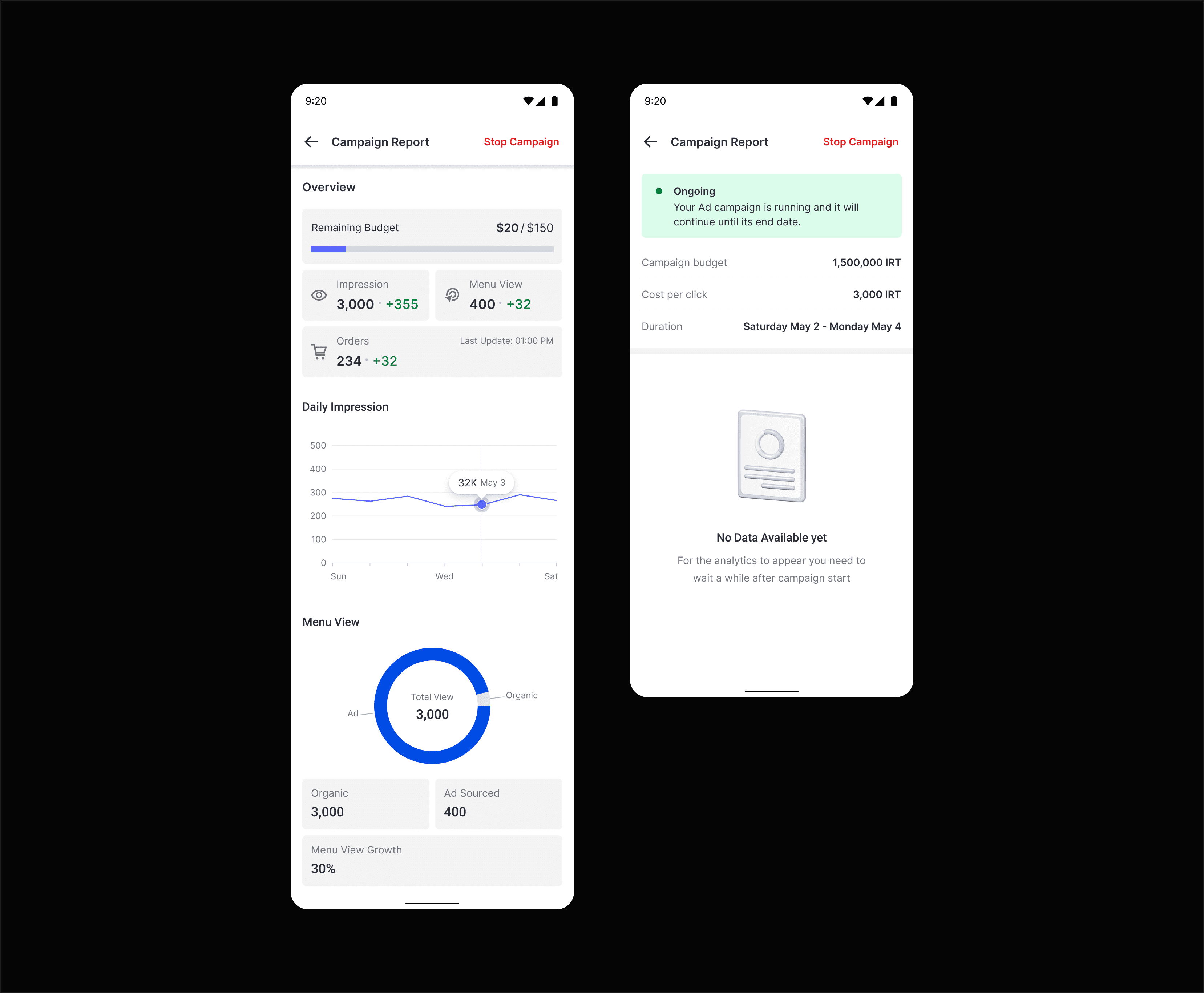 Introduced KPI blocks for spend, ad views, store visits, and orders