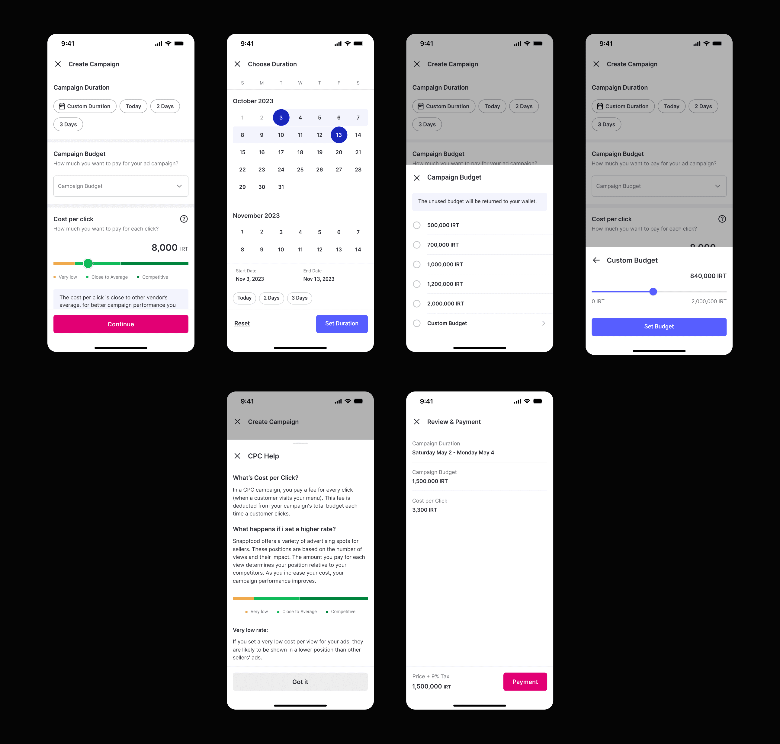 Each screen used real app examples to explain what CPC is, where ads appear, and how campaigns impact visibility and orders.