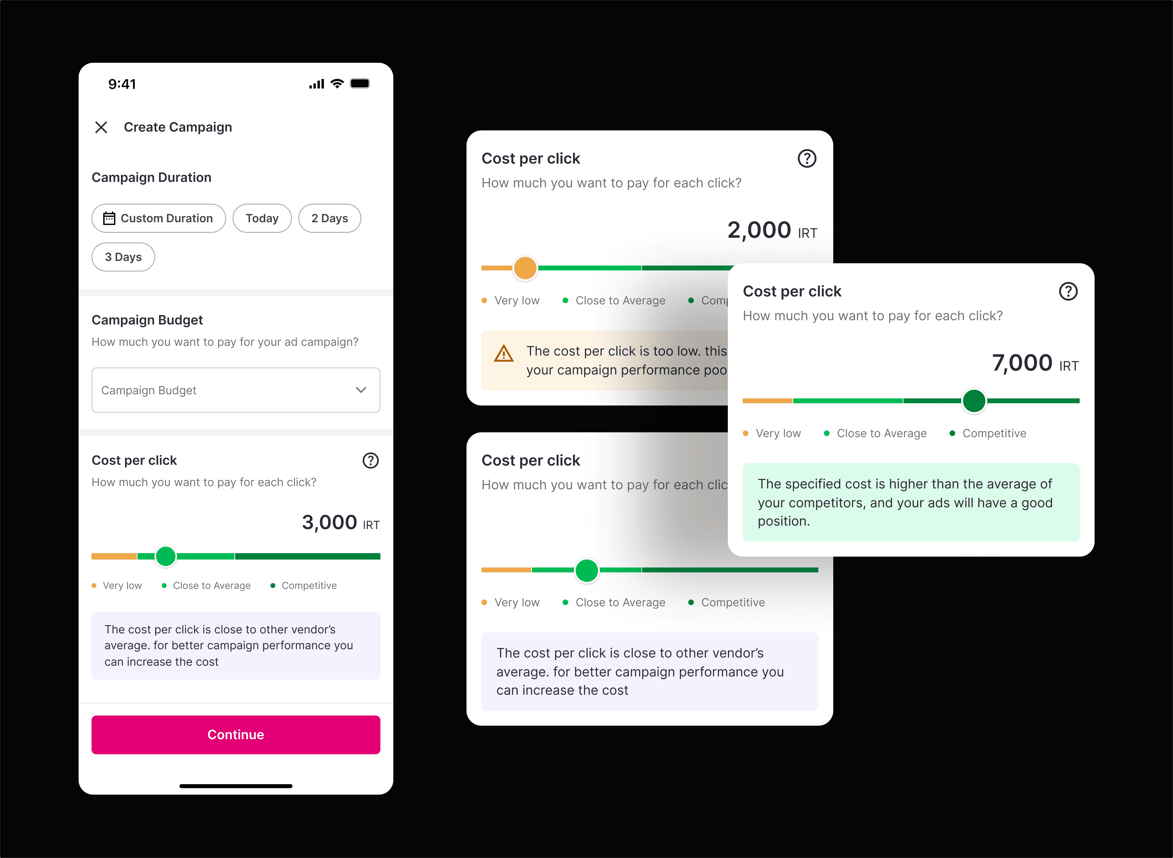 I replaced it with a ranged slider divided into three semantic regions—Low, Average, and High—each paired with a short contextual message describing the impact of choosing bids from that range.